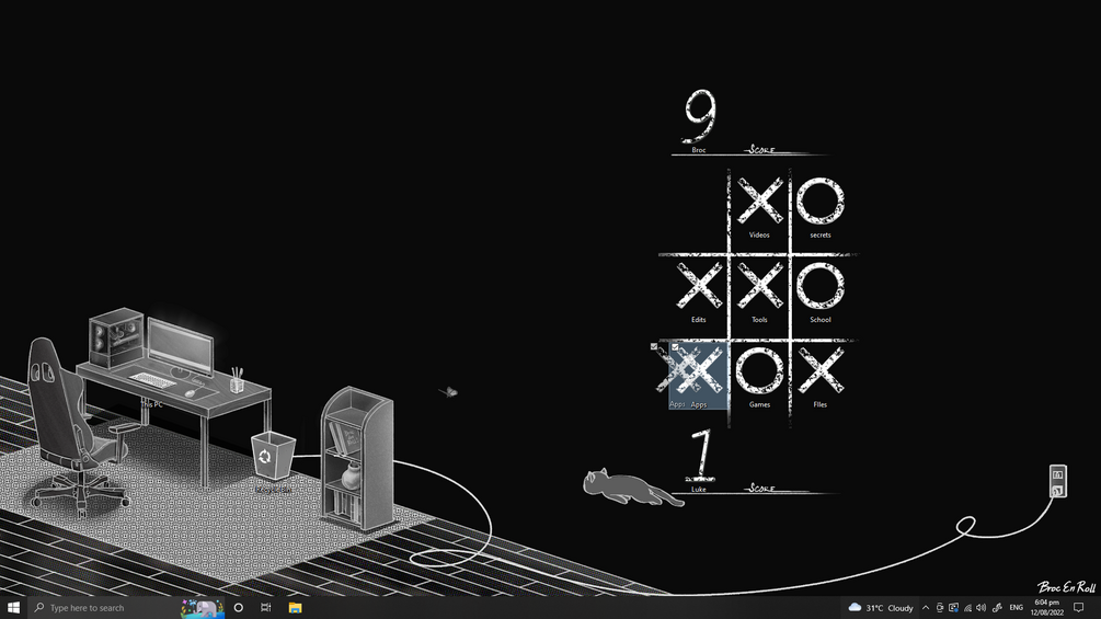 Instant bragging rights to whoever downloads this. This desktop wallpaper is an interactive wallpaper where you can play a tic-tac-toe game with your jealous neighbor. The icon pack that you'll receive includes the X and the O characters, along with the custom scoring Icons (1-9 numeric icons), and some unique Icons for replacing "My Computer" and "Recycle Bin".